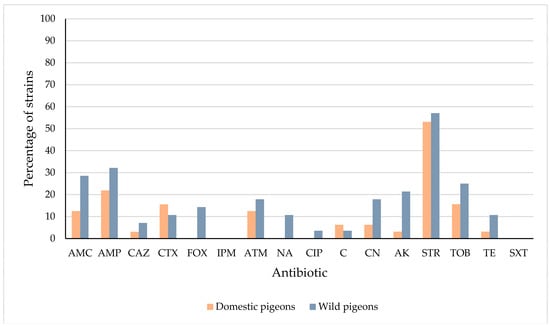 Percentage of Escherichia coli strains from domestic and wild pigeons with resistance or reduced susceptibility to each antibiotic tested. Amoxicillin-clavulanic acid (AMC); ampicillin (AMP); ceftazidime (CAZ); cefotaxime (CTX); cefoxitin (FOX); imipenem (IPM); aztreonam (ATM); nalidixic acid (NA); ciprofloxacin (CIP); chloramphenicol (C); gentamicin (CN); amikacin (AK); streptomycin (STR); tobramycin (TOB); tetracycline (TE); trimethoprim-sulfamethoxazole (SXT).