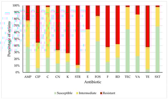The considerable prevalence of resistant or intermediate E. faecalis strains observed in the work being reported here is worrying, since the resistances detected would probably undermine the usefulness as a therapeutic option of several antibiotics used in both human and veterinary medicine. E. faecalis isolates showed resistance to ampicillin (AMP (22.22% of strains), ciprofloxacin (CIP) (55.56%), chloramphenicol (C) (2.22%), gentamicin (CN) (66.67%), kanamycin (K) (71.11%), streptomycin (STR) (88.89%), erythromycin (E) (35.56%), fosfomycin (FOS) (15.56%), nitrofurantoin (F) (62.22%), rifampicin (RD) (57.78%), teicoplanin (TEC) (2.22%), vancomycin (VA) (13.33%), tetracycline (TE) (62.22%) and trimethoprim-sulfamethoxazole (SXT) (2.22%). Resistance or reduced susceptibility was observed for AMP (62.22% of strains), CIP (93.33%), C (77.78%), CN (86.67%), K (84.44%), STR (93.33%), E (97.78%), FOS (53.33%), F (84.44%), RD (77.78%), TEC (35.56%), VA (75.56%), TE (95.56%) and SXT (31.11%), as shown in Table 4 and Figure 3. These high percentages are of concern, because the above-mentioned antibiotics are categorized as “critically important antimicrobials” in the case of ampicillin, ciprofloxacin, gentamicin, kanamycin, streptomycin, erythromycin, fosfomycin, rifampicin, teicoplanin and vancomycin, as “highly important antimicrobials” in respect to chloramphenicol and tetracycline, or as “important antimicrobials” in the case of nitrofurantoin and trimethoprim-sulfamethoxazole, for human medicine [54]. Moreover, ampicillin, ciprofloxacin, gentamicin, kanamycin, streptomycin, fosfomycin, tetracycline and trimethoprim-sulfamethoxazole are classified as “veterinary critically important antimicrobials”, and rifampicin as a “veterinary highly important antimicrobial” [55]. High levels of resistance to such antimicrobials have also been reported in enterococcal strains from various domestic and wild animal species, including pigeons [9,14,45,46,51,61,62,63].
