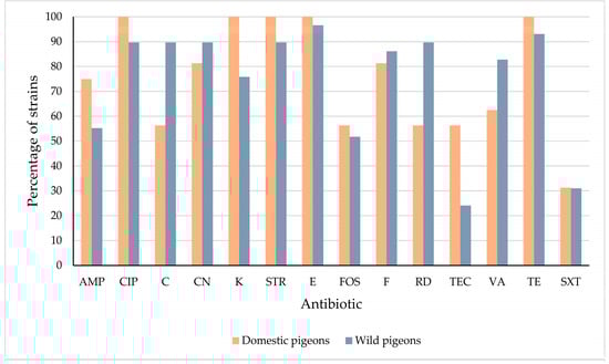 Percentage of Enterococcus faecalis strains from domestic and wild pigeons with resistance or reduced susceptibility to each antibiotic tested. Ampicillin (AMP); ciprofloxacin (CIP); chloramphenicol (C); gentamicin (CN); kanamycin (K); streptomycin (STR); erythromycin (E); fosfomycin (FOS); nitrofurantoin (F); rifampicin (RD); teicoplanin (TEC); vancomycin (VA), tetracycline (TE); trimethoprim-sulfamethoxazole (SXT).