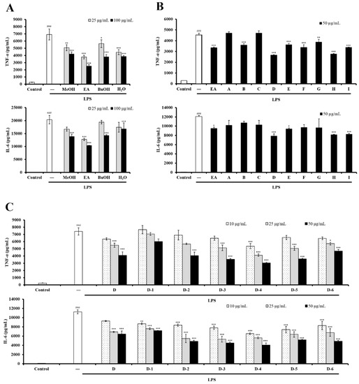 The effects of UC methanolic extract and of its EtOAc-, n-BuOH-, H2O-soluble fractions and subfractions of the EtOAc-soluble fraction on pro-inflammatory cytokine production in LPS-stimulated dendritic cells (DCs). DCs were untreated or treated with LPS (100 ng/mL, white bar). (A) Methanolic extract and EtOAc, n-BuOH, and H2O subfractions (25 μg/mL, gray bar, or 100 μg/mL, black bar) were used. (B) EtOAc and Fr. A to I subfractions (50 μg/mL, black bar) were used. (C) Fr. D and D-1 to D-6 subfractions (10 μg/mL, hatch bar, 25 μg/mL, gray bar, or 50 μg/mL, black bar) were used. Supernatants were collected 6 h after the treatment. The production of cytokines (TNF-α and IL-6) was measured by ELISA. The data shown are the mean ± SD of three independent experiments; ### p < 0.001; * p < 0.05; ** p < 0.01; *** p < 0.001 (Scheffe’s test) for comparisons of the treated and untreated LPS-stimulated DC samples.