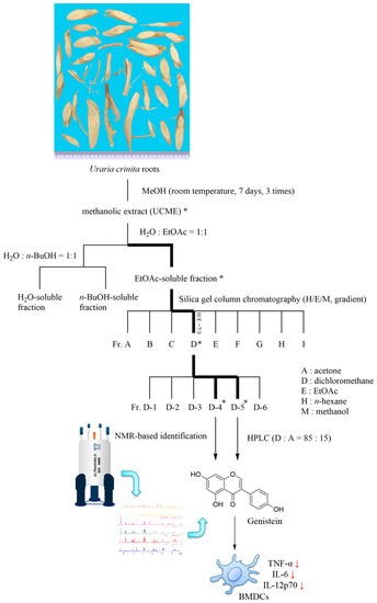 Bioactivity-guided fractionation and NMR-based identification of genistein from the roots of Uraria crinita (UC). * indicates the most potent subfractions or constituents against pro-inflammatory cytokine production in lipopolysaccharide (LPS)-stimulated DCs. UCME: UC root methanolic extract, BMDCs: bone marrow-derived dendritic cells.