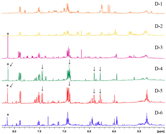 In order to elucidate the association between bioactivity and metabolites in subfractions D-1 to D-6, 1H NMR spectroscopy was conducted (Figure 3). This could offer structural elucidation, achieved by the chemical shift, multiplicity, coupling constant, and integration of metabolite signals in the mixtures.