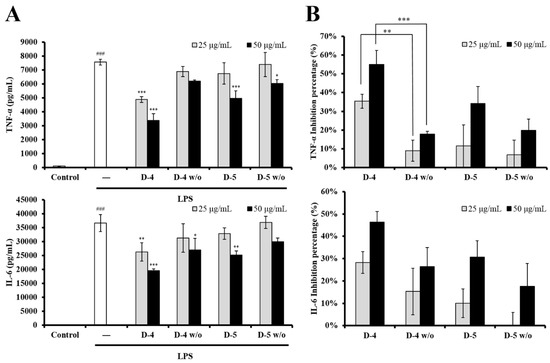 Among them, fraction D significantly inhibited the production of TNF-α and IL-6 in BMDC (Figure 1B). Furthermore, the subfractions D-4 and D-5 from fraction D indicated the most potent inhibitory effects against DC activation (Figure 1C).