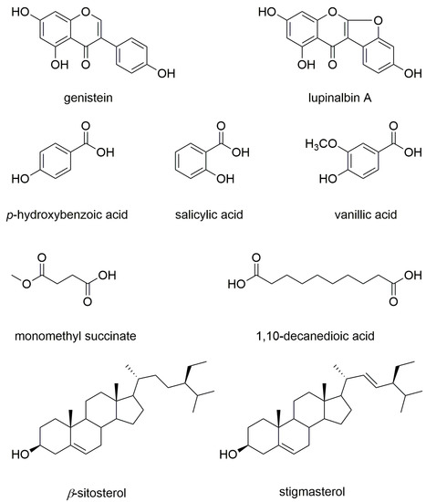 D-4 and D-5 were isolated by semipreparative HPLC (dichloromethane/acetone = 85/15, flow rate = 3 mL/min) to obtain the genistein-knockout subfractions D-4 w/o, D-5 w/o and genistein (24.0 mg, tR = 8.0 min). The genistein-knockout subfractions D-4 w/o and D-5 w/o were further isolated by semipreparative HPLC (n-hexane/acetone = 2/1, flowrate = 3 mL/min) to obtain salicylic acid (tR = 8.3 min), lupinalbin A (tR = 11.0 min), 1,10-decanedioic acid (tR = 11.3 min), monomethyl succinate (tR = 13.2 min), p-hydroxybenzoic acid (tR = 16.7 min), and vanillic acid (tR = 18.5 min).
