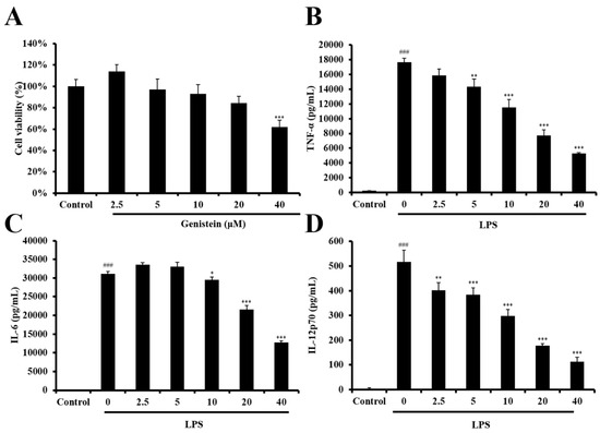 The effect of genistein on cell viability (A) and the production of pro-inflammatory cytokines in LPS-stimulated DCs (B, C, and D). (A) DCs were treated with genistein at various concentrations for 24 hours, and then their viability was measured by the CCK-8 assay (Sigma). DCs were untreated or treated with LPS (100 ng/mL) and LPS + genistein (2.5, 5, 10, 20, and 40 μM), as indicated. Supernatants were collected 6 h after treatment. The production of the cytokines TNF-α (B), IL-6 (C), and IL-12p70 (D) was measured by ELISA. The data shown are the mean ± SD of three independent experiments. ### p < 0.001; * p < 0.05; ** p < 0.01; *** p < 0.001 (Scheffe’s test) for comparisons of the genistein-treated and untreated LPS-stimulated DCs.