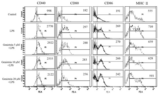 Maturation was determined by measuring the upregulation of MHC class II and three co-stimulatory molecules (CD40, CD80, and CD86), as described previously [31,32]. DCs were untreated or treated with LPS (100 ng/mL) or LPS + genistein (5, 10, and 20 μM) for 24 h. Cell aggregation was examined by microscopy (40×). Then, the cells were stained with monoclonal antibodies (mAbs), specific to mouse CD11c, MHC class II, CD40, CD80, and CD86 (Biolegend), and analyzed by flow cytometry. The fluorescence intensity of MHC class II, CD40, CD80, and CD86 was determined, following gating with a forward side scatter (FSC) and CD11c+ expression. The change in the mean fluorescence intensity (MFI) from LPS alone to LPS + genistein was indicated.