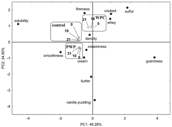 Principal component analysis biplot of sensory parameters used to differentiate yogurt with increased whey proteins content, including whey proteins after the polymerization process. 0, 10, 21, days of cold storage; WPC, yogurt with whey protein concentrate; PWP, yogurt with polymerized whey protein; PC, principal component.