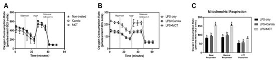 In an in vitro model using a RAW 264.7 murine macrophage cell-line, canola oil, known for its anti-oxidant and anti-inflammatory effects which inhibit the production of nitric oxide and prostaglandin E2 [12], served as a control. Cytotoxicity of canola or MCT oil emulsified in DMSO, as well as the vehicle itself, was determined by MTT assay. Neither oil affected cell viability up to 100 μg/mL (data not shown), and the oil concentration was set to 10 μg/mL thereafter through the study. In non-stimulated conditions, OCR of mitochondria were not more strongly affected by MCT oil compared to canola oil and non-oil-treated control (Figure 1A). However, following an onset of inflammatory cues by LPS treatment, there was a significant increase of mitochondrial respiration in MCT treated cells (Figure 1B, circle), compared to canola (square) or non-oil-treated (triangle) controls. Throughout the OCR measurements, oligomycin, FCCP, and rotenone/antimycin A were sequentially injected to specifically calculate the cellular oxygen needed for basal respiration, maximal respiration, and ATP production [13]. As quantitatively assessed, MCT oil significantly up-regulated OCR for basal respiration (153.58 ± 4.57 pmoles/min/10E5 cells), maximal respiration (153 ± 7.15 pmoles/min/10E5 cells), and ATP production (79.62 ± 0.26 pmoles/min/10E5 cells), while canola (93.03 ± 3.88 pmoles/min/10E5 cells for basal respiration, 97.91 ± 4.28 pmoles/min/10E5 cells for maximal respiration, and 57.97 ± 4.75 pmoles/min/10E5 cells for ATP production) and non-oil-treated (83.29 ± 0.63 pmoles/min/10E5 cells for basal respiration, 86.78 ± 1.65 pmoles/min/10E5 cells for maximal respiration and 54.48 ± 0.79 pmoles/min/10E5 cells for ATP production) controls exhibited no differences (Figure 1C).