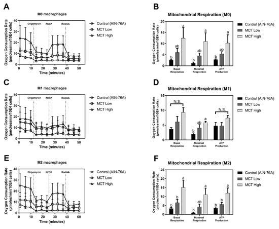 MCT upregulates OXPHOS in non-polarized and M2 polarized BMDMs. To assess OCR in non-polarized (M0) and polarized (M1 and M2) conditions, bone marrow-derived macrophages were collected from C57BL/6 mice fed with custom diets (AIN-76A, MCT Low, MCT High) and treated with macrophage colony-stimulating factor (M-CSF). Following stimulation with LPS/IFN-γ for M1 polarization or interleukin (IL)-4/IL-13 for M2 polarization, cells were transferred to Seahorse microplates for assessing OCR. OCR was assessed using a Seahorse Extracellular Flux analyzer in non-polarized (A), M1 (C), and M2 (E) polarized conditions. The mitochondrial respiration parameters (basal respiration, maximal respiration, and ATP production) were calculated and are presented as pmoles/min in each non-polarized (B), M1 (D), and M2 (F) polarized BMDMs. Data are indicated as mean ± SEM (n = 4), and significant differences are indicated with different letters (p < 0.05, N.S. means no significant difference) within each basal respiration, maximal respiration, and ATP production column (B, D, and F).