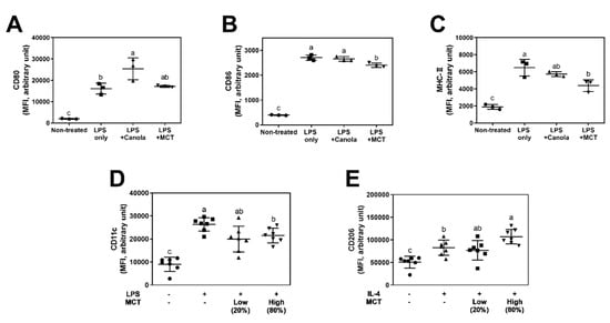 MCT induces macrophages to have anti-inflammatory phenotypes by modulating the expression of surface markers. CD80 (A), CD86 (B), and MHC-II (C) expressions of RAW 264.7 cells were evaluated following oil treatment and/or LPS stimulations (n = 3). CD11c (D) was evaluated for the M1 marker and CD206 (E) for the M2 marker in BMDMs from mice fed with custom diets following LPS and IL-4 stimulation, respectively (n = 7). Cells were stained with antibodies specific to surface molecules and analyzed by a flow cytometer. Values are indicated as mean ± SEM, and statistical significance is indicated with different letters (p < 0.05).