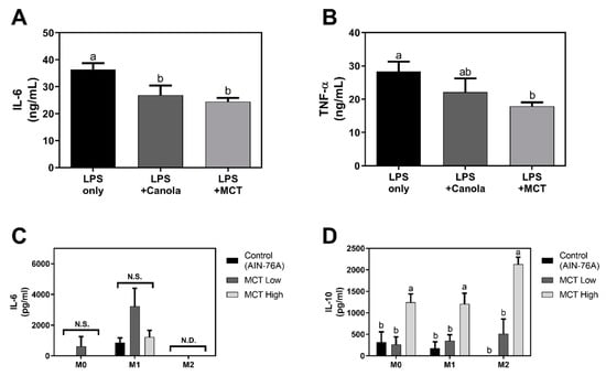 MCT inhibits the production of pro-inflammatory cytokines while enhancing anti-inflammatory cytokine secretion. IL-6 (A) and TNF-α (B) production of RAW 264.7 macrophages treated with conventional oil samples under LPS-stimulated conditions (n = 3). Pro-inflammatory cytokine, IL-6 (C), and anti-inflammatory cytokine, IL-10 (D) secretion by mice BMDMs under non-polarized (M0), M1, and M2 polarized conditions (n = 7). The quantification of cytokines in culture supernatants was determined by ELISA. Data are indicated as mean ± SEM, and statistical significance is presented with different letters (p < 0.05, N.S. means no significant difference, N.D. means not detected) within each M0, M1, and M2 column (C,D).