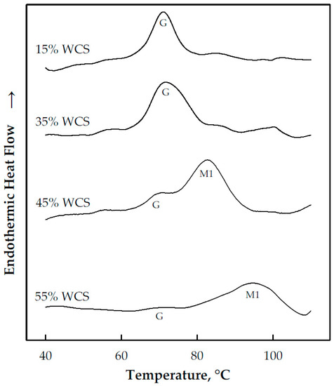 The gelatinization of WCS used in this study was characterized by the G and M1 endotherms (see Figure 2), particularly due to the high amylopectin content of the starch. According to Fukuoka et al. [9], the G endotherm can be used as a first-order estimate of ∆Hn, even in the limited water condition due to the small contribution of M1 to the gelatinization enthalpy. This, together with previous observations that the endothermic ∆Hn can be considered constant and maximum in the excess water region [9,10,11,12], indicates that the G endotherm can be used to identify the transitional water content when the WCS/water mixture shifts from the excess water to limited water conditions.