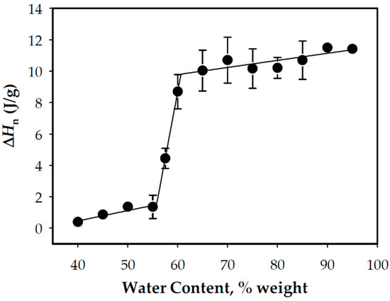 The specific endothermic enthalpy, ∆Hn, based on the G endotherm as a function of the water content in a wet basis.