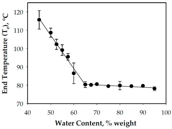 In the excess water condition, gelatinization proceeds rapidly to a certain extent which depends on cooking temperature. Several studies [6,12,13,14,15] have indicated that for a given water content, there is a minimum temperature, below which complete starch gelatinization cannot be accomplished. The degree of gelatinization completion is designated as the terminal extent of gelatinization (TEG) [9], which, due to its linear relationship with the enthalpy of gelatinization (∆H) [6], can be calculated using the equation: