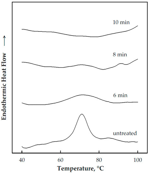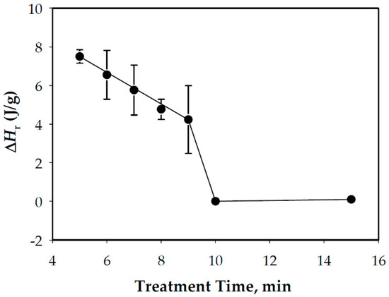 A WCS/water (contains 85% weight water) mixture in the excess water condition was subjected to thermal treatment at 85 °C, which was previously determined (Section 3.2) as the upper range of minimum temperature for complete WCS gelatinization. Representative DSC curves of the treated samples at different times are presented in Figure 6, which indicate that a cooking time of ~10 min was sufficient enough to fully gelatinize the WCS. This is supported by the calculated ∆Hr at different treatment times shown in Figure 7.