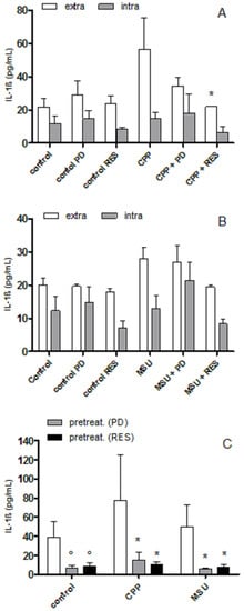 3.2. The Effect of PD and RES on Intra- and Extra-cellular Levels of IL-1β