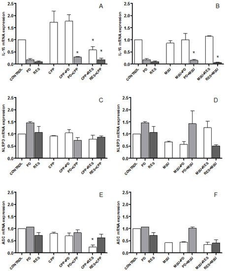 3.3. The Effect of PD and RES on IL-1β, NLRP3 and ASC Expression