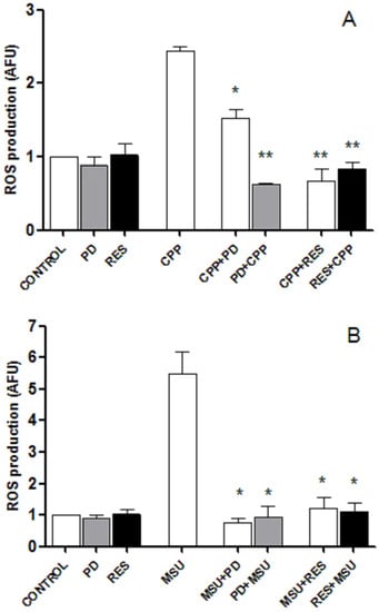 3.4. RES and PD Inhibit ROS Production Induced by Crystals