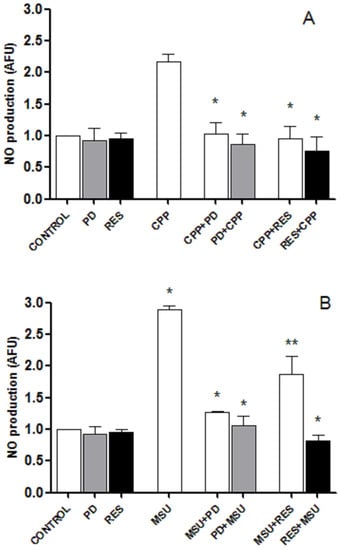 3.5. RES and PD Inhibit Nitric oxide Production Induced by Crystals