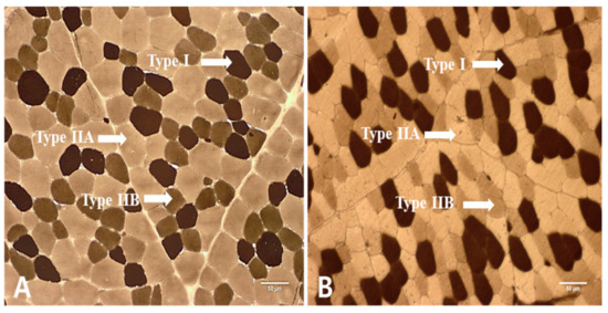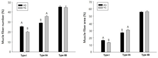 Muscle fibers in LT muscles obtained from KNBG were divided into type I, IIA, and IIB, as shown in Figure 1. The results of muscle fiber number (%) and muscle fiber area (%) of LT muscle from AG and YG are presented in Figure 2. Numerically counted fiber number percentages of type I were significantly higher in AG as compared to YG (p < 0.05). In contrast, to type I fiber, fiber number percentages of type IIA fiber were higher in YG than those in AG (p < 0.05). The results of muscle fiber area showed a similar pattern to muscle fiber number.