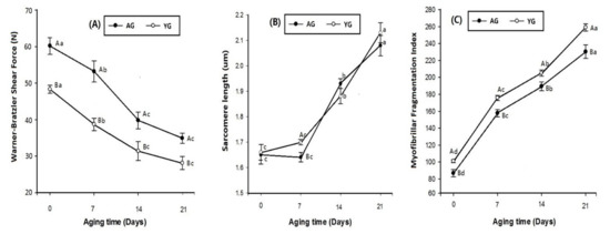 Warner–Bratzler shear force (A), sarcomere length (B), and myofibrillar fragmentation index (C) of goat meat LT muscle. Different letters in the figure indicate significant differences for days post mortem (a–c) and slaughter age (A–B) (p < 0.05).