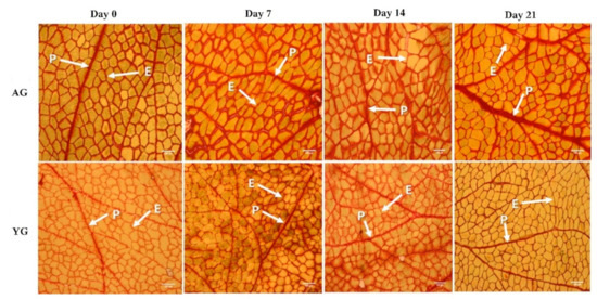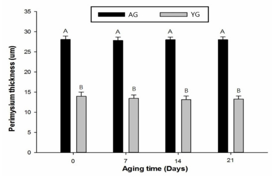 The PMT of AG was significantly higher than that of YG (p < 0.05), while days post mortem had no effect on PMT as shown in Figure 4 and Figure 5. Goat age had a significant impact on PMT, with very thick perimysium in AGs as compared to YGs. Previously, Wojtysiak [51] described that pork slaughtered at different ages (90, 150, and 210 days) had significant differences in PMT (22.16, 31.67, and 41.53 µm, respectively). These structural arrangements are similar to those noted earlier in the skeletal muscle of various animal species.
