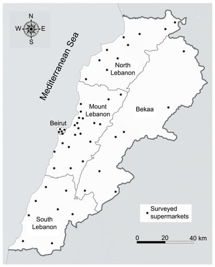 Location of the fifty surveyed supermarkets in Lebanon within the five administrative regions according to population density.