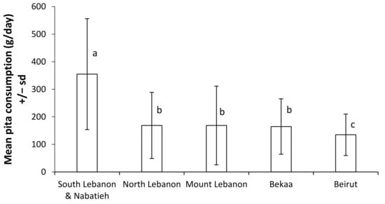 White pita consumption varied according to region (Figure 2), and the highest consumption corresponded to South Lebanon and Nabatieh (355 g/day). There were no significant differences between the North, Mount Lebanon, and Bekaa regions, which were two-fold lower than South Lebanon and Nabatieh. The lowest consumption was observed in Beirut (135 g/day). This last value is in agreement with the adult population of Beirut studied by Nasreddine et al. [].