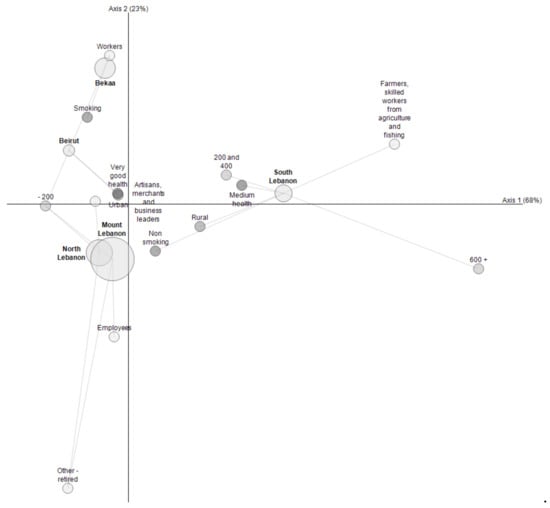 In order to better explore the relationships between adult consumption and regions, a data-mining tool was used, the purpose of which was to represent in only one table or figure the most significant results from several cross analyses (based on multivariate correspondence analysis []). A pivot variable was first selected—the region—then other variables were crossed with it. Figure 3 shows the results of crossing region and consumption, gender, socio-professional category, smoking habits, physical activity (4 categories: “No”, “Yes, strenuous”, “Yes, low”, and “Yes, medium”), and area (urban or rural), using the most specific modalities as key views.