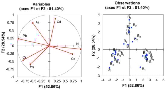 All variables were well represented in the F1–F2 plot (sum of squared cosine above 0.75). The PCA shows that the following elements were correlated: Ni and Co, As and Pb as well as Cr and Hg. Lead and Co were anti-correlated, as well as Ni and Pb. There was no correlation between Cd and Co, Cd and Pb, Cr and As as well as Hg and As. The Pearson correlation matrix is provided in Supplementary Materials Table S2. We observed three separate groups: B1, B2, and B3. The dispersion in B2 and B3 was larger than in B1; this dispersion can be explained by a more homogeneous sampling for B1.