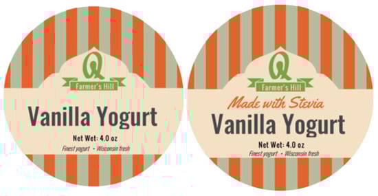 The vanilla yogurt used in this study was obtained from the Cornell Dairy (Ithaca, NY, USA) and was divided into 1 oz samples in transparent plastic containers in the sensory kitchen. The labels were designed with the purpose of disguising the study as a commercial sensory evaluation (see Figure 1), with labels matching in color, size, font, and graphics, with only the description differing. In total, 5 samples were served, including one sample without a claim on the label (termed unlabeled). Although taste may be key in determining liking [9], to isolate the effects of labeling, all products tested were identical.