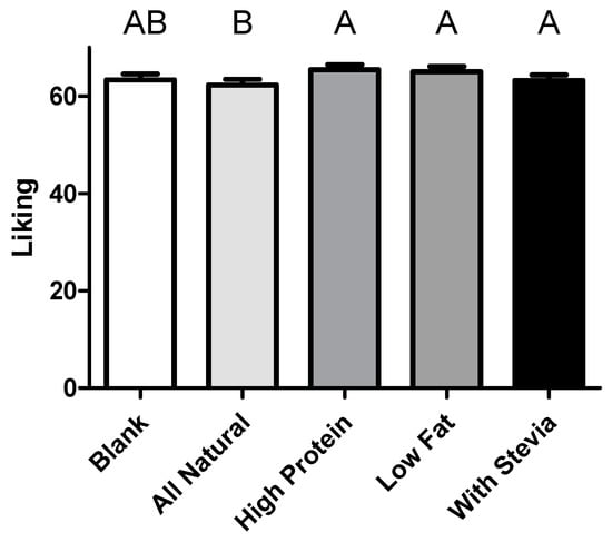 The goal of the study was to analyze the influence of popular labels (all-natural, low sugar, low fat, and made with stevia) on the liking of yogurt. Results demonstrated higher liking for samples labeled as high-protein and low-fat, with an all-natural claim leading to the lowest level of liking. Our findings support those of previous market research suggesting that consumers prefer high protein in yogurt samples, as well as work showing low-fat samples were rated as better tasting [17,23,40,41]. This consistency supports the importance of labels in determining food preference, highlighting potential implication in food marketing and consumer behavior. These findings may also have implications for regulatory agencies such as the Food and Drug Administration (FDA), to further refine their labeling guidelines. In previous studies, improved taste was reported for yogurt labeled as all-natural [12], despite its lack of a firm legal definition, with no effect on sensory ratings for yogurt labelled as low-fat [25]. Our results are some of the first to detail the effect of high-protein and made-with-stevia labeling on consumer responses.