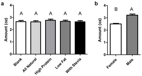 Ideal amount of consumption by label (a) and sex (b). Y-axis denotes ounces, with panelists advised a usual serving is 4 oz. Letters denote significant differences. Bars denote mean plus standard error.