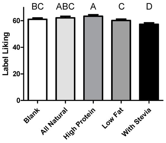 Willingness to pay was dictated only by a panelist’s liking for the label attached to the samples (p < 0.001), although samples’ WTP was somewhat a reflection of liking scores, with high protein highest, followed by low-fat, similar to liking. Despite similar ordering, label did not statistically affect WTP (p = 0.161). The appeal of the labels differed significantly (p < 0.001), despite only wording changing between presentations. The most appealing labels were “high-protein” and “all-natural” respectively (Figure 4), with “made with stevia” the least appealing and “all-natural” only slightly better, with both liked less than those with no identifying claims at all.