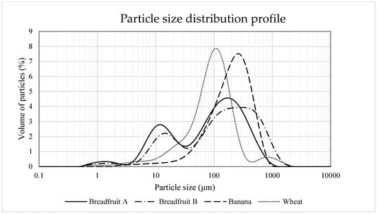 Particle size distribution profiles of tropical flours compared with a traditional flour. Treatments were flour types of breadfruit A, breadfruit B, banana, or wheat. Breadfruit flour A was sourced from Natural Foods International (Apia, Western Samoa). Breadfruit flour B was sourced from Jungle Project (Alajuela, Costa Rica). Banana flour was sourced from LiveKuna, Kunachia LLC (Davie, FL, USA). Wheat flour was obtained commercially from Bulk Barn Foods (Aurora, ON, Canada).