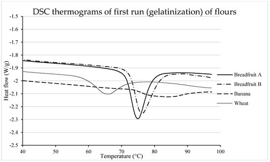 The melting of double helices of starch chains was evaluated through DSC (Table 3, Figure 2). Flours from tropical fruits (especially banana flour) were characterized with greater (p < 0.05) T0, Tp, and Tc when compared with wheat flour. This could be the result of greater heat stability of double helices comprised by longer amylopectin chains. In fact, Roman et al. reported greater gelatinization temperatures for banana starch, which was attributed to the longer population of short chains (i.e., A and B1 amylopectin chains) [13]. These results would suggest that breadfruit starch contains amylopectin with a longer population of short chains than those from wheat starch, although shorter than those reported for banana starch. Meanwhile, the enthalpy of the gelatinization peak was in the order of breadfruit flour, wheat flour, and then banana flour, which is assumed to be related to the amylose: amylopectin ratio. Therefore, breadfruit flours are assumed to have lower amylose: amylopectin ratio than wheat, whereas banana starch would have a high amylose ratio, which would agree with results previously reported by Roman et al. [13].