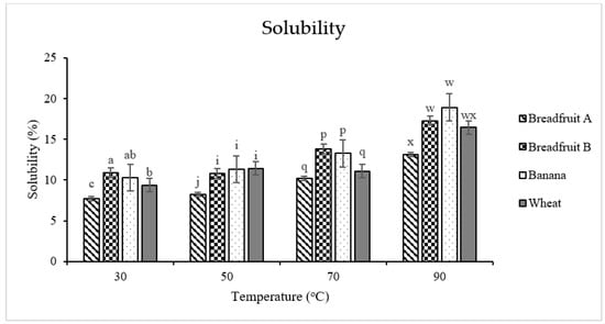 Solubility of tropical flours compared with a traditional flour. Within each temperature, means without a common superscript differ (p ≤ 0.05). Treatments were flour types of breadfruit A, breadfruit B, banana, or wheat. Breadfruit flour A was sourced from Natural Foods International (Apia, Western Samoa). Breadfruit flour B was sourced from Jungle Project (Alajuela, Costa Rica). Banana flour was sourced from LiveKuna, Kunachia LLC (Davie, FL, USA). Wheat flour was obtained commercially from Bulk Barn Foods (Aurora, ON, Canada).