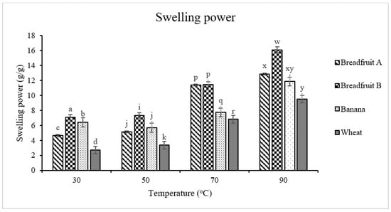 Swelling power of tropical flours compared with a traditional flour. Within each temperature, means without a common superscript differ (p ≤ 0.05). Treatments were flour types of breadfruit A, breadfruit B, banana, or wheat. Breadfruit flour A was sourced from Natural Foods International (Apia, Western Samoa). Breadfruit flour B was sourced from Jungle Project (Alajuela, Costa Rica). Banana flour was sourced from LiveKuna, Kunachia LLC (Davie, FL, USA). Wheat flour was obtained commercially from Bulk Barn Foods (Aurora, ON, Canada).