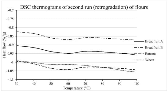 DSC thermograms (retrogradation) of tropical flours compared with a traditional flour. Treatments were flour types of breadfruit A, breadfruit B, banana, or wheat. Breadfruit flour A was sourced from Natural Foods International (Apia, Western Samoa). Breadfruit flour B was sourced from Jungle Project (Alajuela, Costa Rica). Banana flour was sourced from LiveKuna, Kunachia LLC (Davie, FL, USA). Wheat flour was obtained commercially from Bulk Barn Foods (Aurora, ON, Canada).