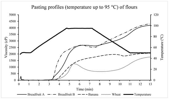 The pasting properties of tropical flours compared with a traditional flour using RVA method #1 (maximum temperature of 95 °C). Treatments were flour types of breadfruit A, breadfruit B, banana, or wheat. Breadfruit flour A was sourced from Natural Foods International (Apia, Western Samoa). Breadfruit flour B was sourced from Jungle Project (Alajuela, Costa Rica). Banana flour was sourced from LiveKuna, Kunachia LLC (Davie, FL, USA). Wheat flour was obtained commercially from Bulk Barn Foods (Aurora, ON, Canada).