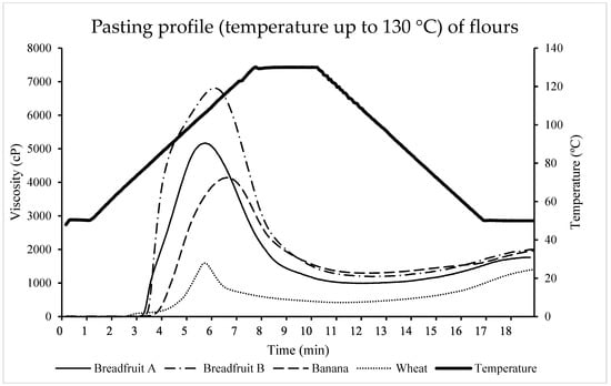 For the pasting results of the second method (temperature was increased to 130 °C), the peak viscosity, trough viscosity, and final viscosity of the tropical flours, was greater (p < 0.05) compared with wheat flour (Table 5). The differences of viscosity might be explained by the combination effects of the test conditions, the composition of carbohydrates in the flour, the ratio of amylose to amylopectin, and the resistance of their starch granules to swell. The peak time of tropical flours was longer (p < 0.05) than that of the wheat flour. However, pasting temperature did not statistically differ (p = 0.46) among treatments. Moreover, the viscosity of all the flours decreased during temperature holding at 130 °C (Figure 7). The breakdown of the tropical flours was greater (p < 0.05) than wheat flour. The peak viscosity and the breakdown were much greater than those of using the first RVA method. The differences between using the first and the second RVA method may be caused by different components such as protein and fat were attached to starch granules, which leads to uncompleted gelatinization process of the flours under 100 °C. The flours might need higher temperature to become fully gelatinized. It is interesting to note that the tropical flours had extraordinary swelling power, especially breadfruit flour, although they did not resist heating and the viscosity decreased significantly.