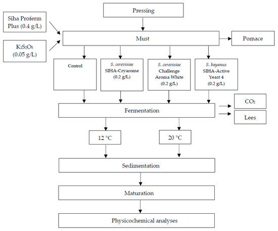 The white wine technology process is shown in Figure 1. Manually, harvest grapes (approximately 60 kg) were destemmed, crushed and pressed with a hydraulic press machine (TOYA, Wrocław, Poland).