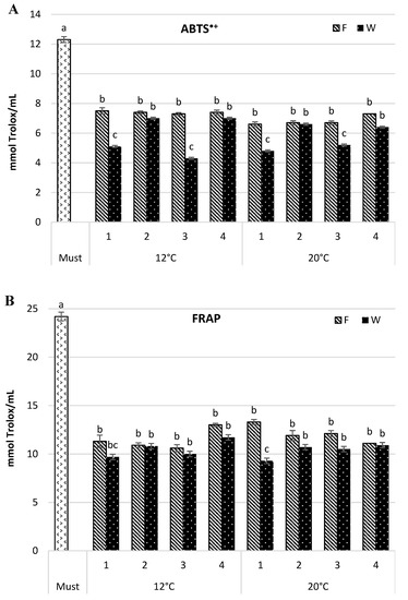 Antioxidant capacity (mmol Trolox/mL) by 2,2′-azinobis-(3-ethylbenzothiazoline-6-sulfonic acid)] radical cation (ABTS•+) (A) and ferric-reducing antioxidant power (FRAP) (B) in Aurore must and wine. F—wine after fermentation; W—wine after maturation. Yeast strain: 1—Spontaneous fermentation, 2—S. cerevisiae SIHA® Cryarome, 3—S. cerevisiae Challenge Aroma White, 4—S. bayanus SIHA® Active Yeast 4. Values (a, b, c) followed by the same letter were significantly different (p < 0.05) according to Duncan’s test.
