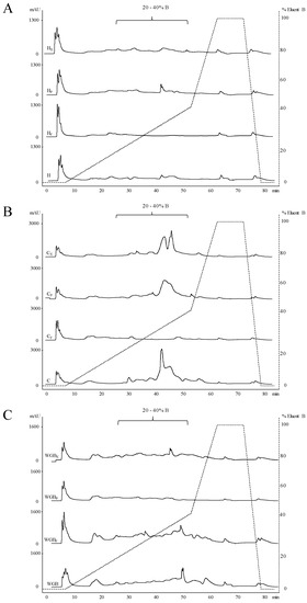 Reversed-Phase Fast Performance Liquid Chromatography (RP-FPLC) peptide profiles of hemp, chickpea and wheat germ/bran doughs. (A): H, untreated hemp dough; HF, fermented hemp dough; HP, hemp dough treated with proteases (E1/E2); HX, hemp dough treated with xylanase (Depol 761P). (B): C, untreated chickpea dough; CF, fermented chickpea dough; CP, chickpea dough treated with proteases (E1/E2); CX, chickpea dough treated with xylanase (Depol 761P). (C): WGB, untreated wheat germ/bran (1:4) dough; WGBF, fermented wheat germ/bran (1:4) dough; WGBP, wheat germ/bran (1:4) dough treated with proteases (E1/E2); WGBX, wheat germ/bran (1:4) dough treated with xylanase (Depol 761P).