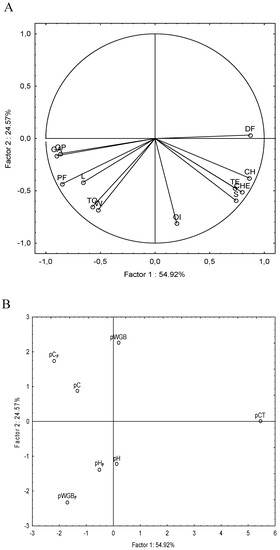Loading plot (A) and score plot (B) of first and second principal components after principal component analysis (PCA) based on based on sensory analysis of pasta: pH, pasta containing 11% (wt/wt; d.m.) unfermented hemp dough; pHF, pasta containing 11% (wt/wt; d.m.) fermented hemp dough; pC, pasta containing 11% (wt/wt; d.m.) unfermented chickpea dough; pCF, pasta containing 11% (wt/wt; d.m.) fermented chickpea dough; pWGB, pasta containing 17% (wt/wt; d.m.) unfermented wheat germ and bran (1:4) dough; pWGBF, pasta containing 17% (wt/wt; d.m.) fermented wheat germ and bran (1:4) dough; pCT, pasta made only with semolina and water. The data are the means of three independent experiments ± standard deviations (n = 3). The attributes used in sensory analysis were: GA, general acceptability; OI, Odor Intensity; OP, Odor pungent; CH, Color Heterogeneity; S, Sapidity; PF, Pungent Flavor; DF, Delicate Flavor; TE, Texture; CHE, Chewability; ST, Stacking; L, Legume; W, Whole; TO, Toasted.