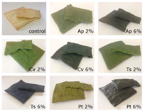 As documented by numerous studies, microalgae are one type of the potential ingredients that can be used to enhance the nutritional value of food [,,], in particular of cereal-based products such as cookies [,,], bread [,], pasta [,,], and extruded snacks []. To our knowledge, no study with microalgae-enriched crackers has been published so far.