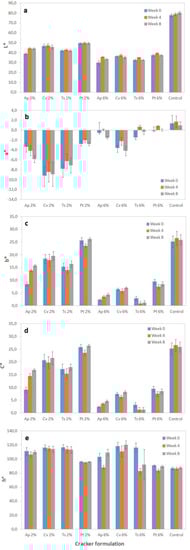 Microalgae crackers presented unusual and visually attractive colors, as can be observed from the photos shown in Figure 1. The evolution of color parameters throughout storage time (0, 4, and 8 weeks) in terms of lightness (L*), greenness (a*), yellowness (b*), chroma (C*), and hue (hº) is represented in Figure 2.