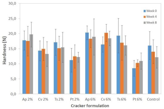 For all the samples, a significant variation in cracker hardness throughout the eight-week study was not observed (p > 0.05), which means that the texture properties remained stable, a relevant quality in terms of sensory acceptance by the consumer.