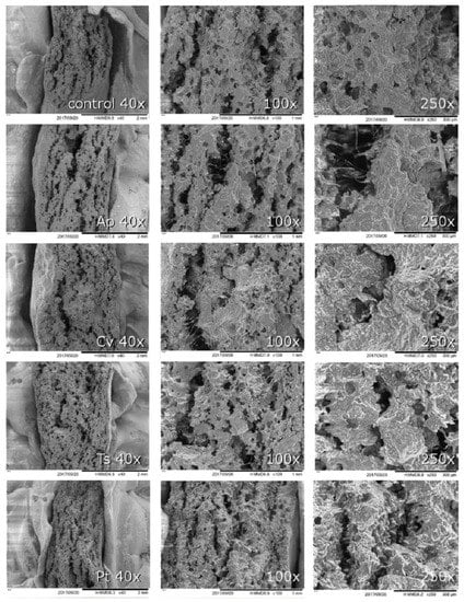 The samples with 2% microalga incorporation, as well as the control, were also analyzed by SEM. From the microscope images (Figure 4) it seems that the control sample presents a denser and more continuous structure, while crackers with microalgae seem to have a slightly more porous and heterogeneous microstructure.