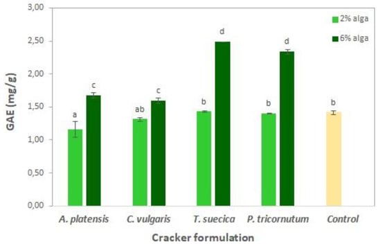 Figure 5 represents the total phenolic content of the cracker samples. The addition of 2% microalgae biomass did not promote significant (p > 0.05) differences in phenolic content in relation to the control (1.4 mg GAE g−1). However, when increasing microalgae biomass content to 6%, phenolic content significantly (p < 0.05) increased to 1.6–1.7 mg GAE g−1 for A. platensis and C. vulgaris and to 2.3–2.5 mg GAE g−1 for T. suecica and P. tricornutum, which corresponds to a net total phenolics increase of about 0.3 and 1 mg GAE g−1 compared to the control, respectively.